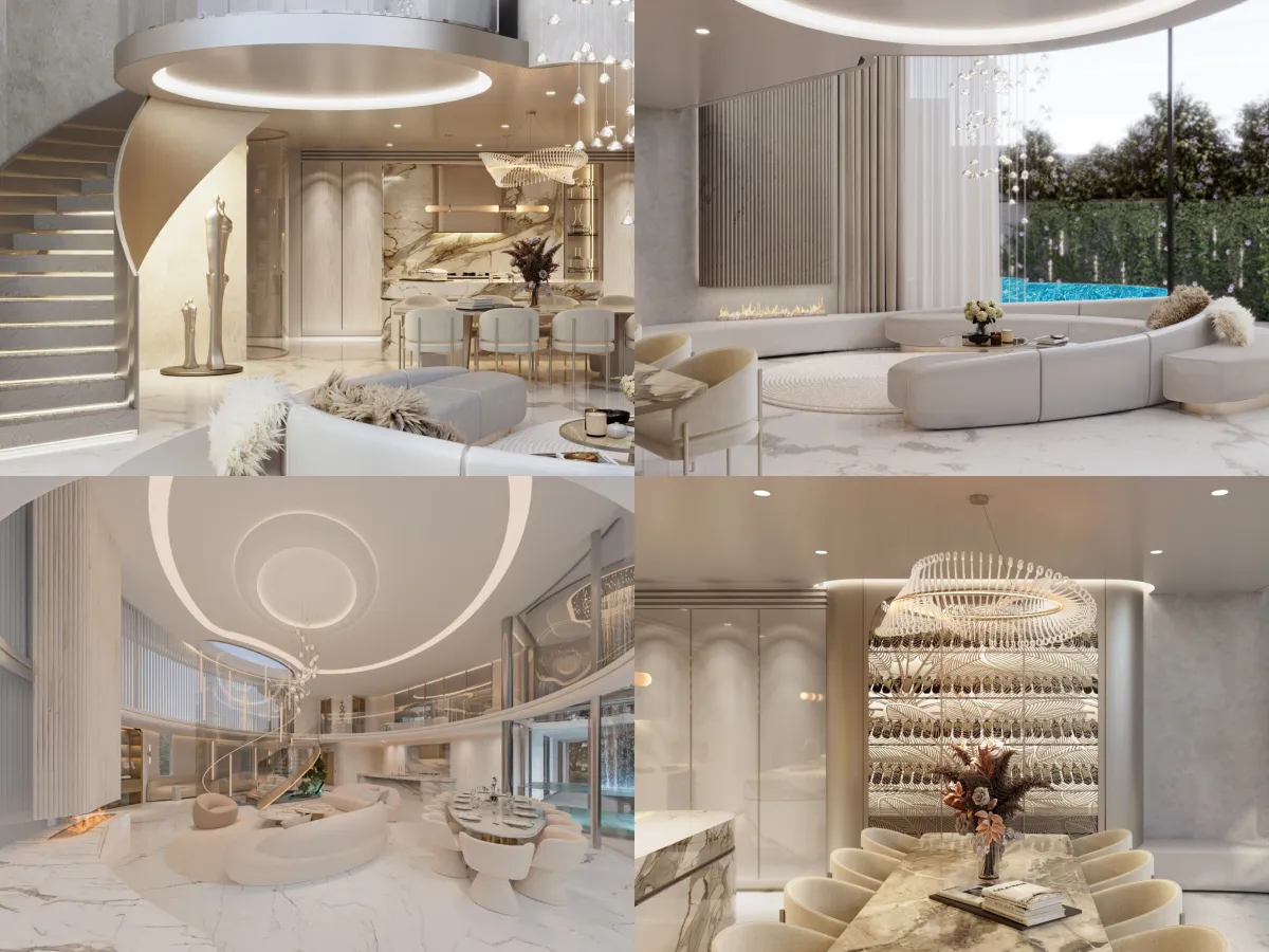 Inside, grand volumes are amplified by circular voids, floating staircases, mesh chandeliers, and fluted wall detailing. Each residence includes a wine and whisky bar, bespoke lighting, media rooms, and seamless transitions between indoor and outdoor entertaining spaces. Residences open to their private curved pool terraces, and the garden residences are immersed in landscaping.